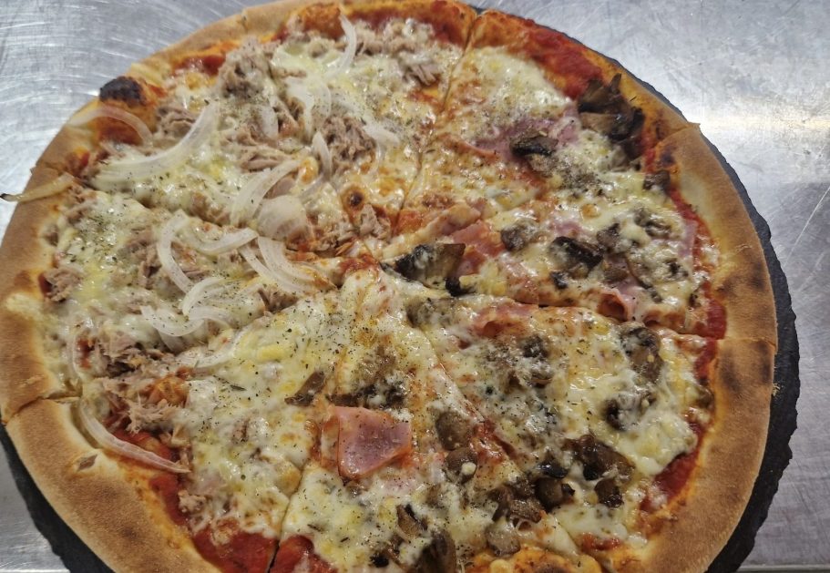 Leckere hausgemachte Pizzen, z. B. Margherita, Salami, Schinken & Champigons, Thunfisch & Zwiebeln, Gyros & Zwiebeln
